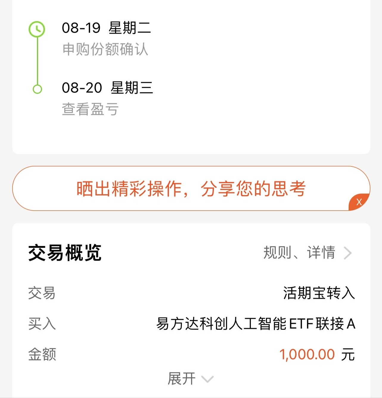 今天股市高开高走,到处洋溢着牛市的氛围。我最近比较看好$易方达科创人工智能ETF联接A(OTCFUND|023564)$,该基金比中证AI指数更具业绩弹性,是捕捉AI行情的更好选择。今天科技板块大涨,担心追高可以采取定投方式分批建仓。我今天小额加仓1000元,等后续再分批加仓!