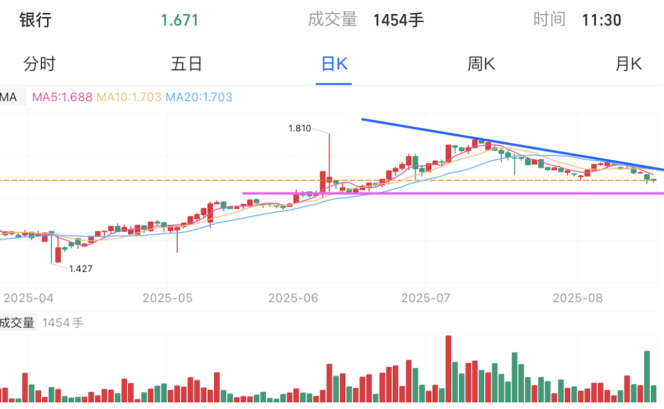 银行属于防御板块,是为数不多的下行板块。此前市场盘整时它一直震荡上行,最近力竭回调,这两日放量下跌,跌破支撑位,后市继续下行概率大。