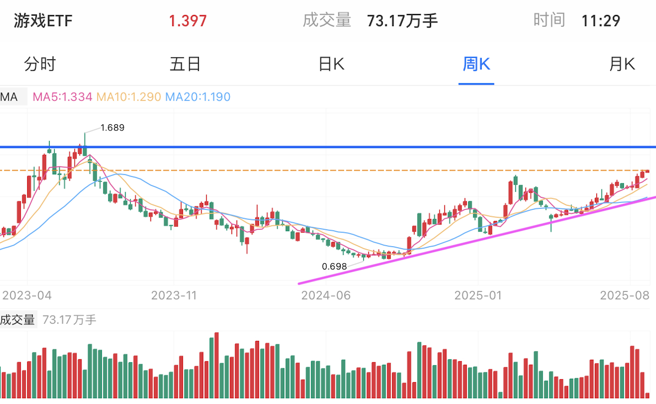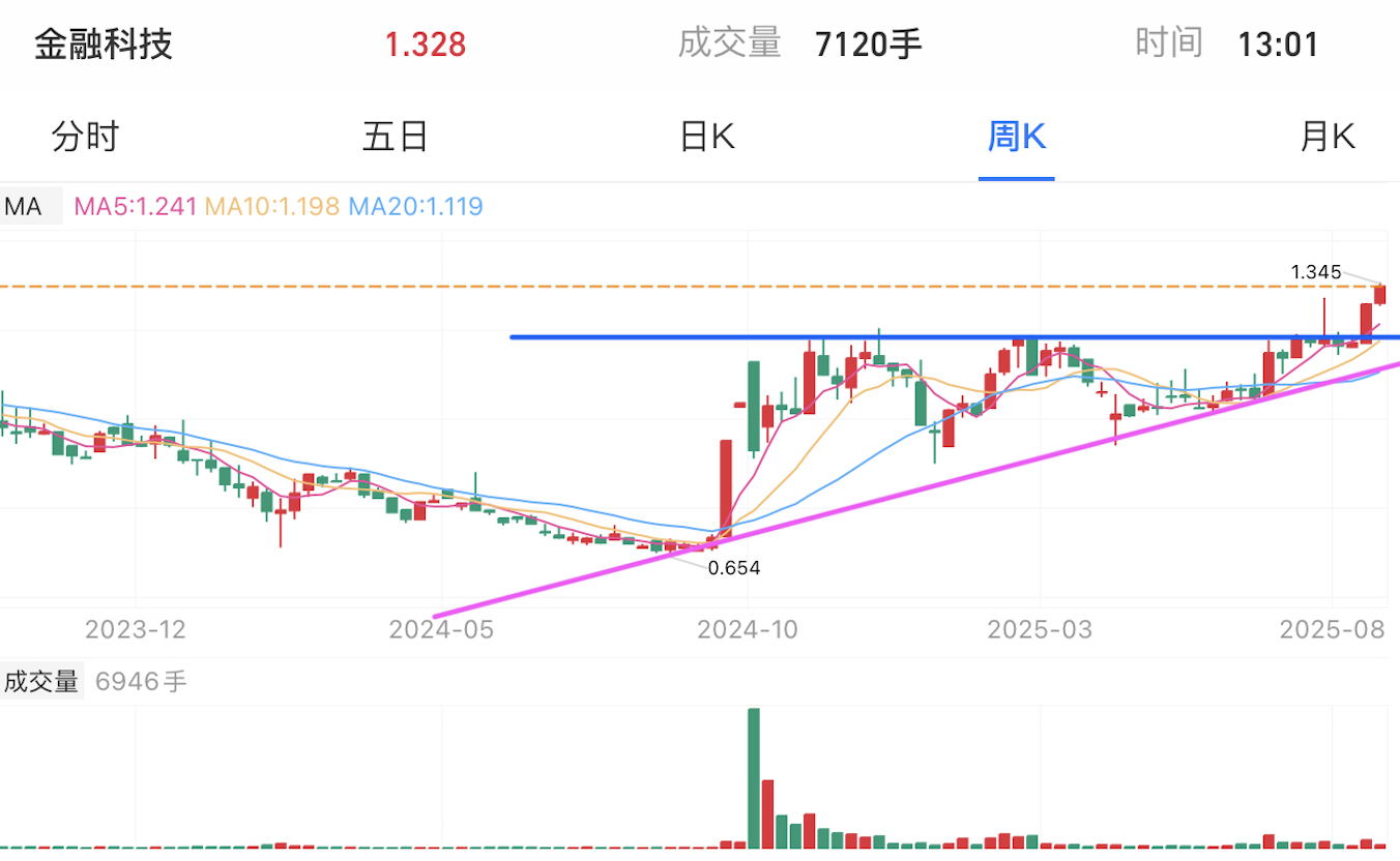 金融科技最近活跃,从周线突破看,它经历长期盘整后最近突破关键压力位,这几日大幅拉升,如果不是见顶就新行情刚刚开启,后者概率高。本人今日将游戏够7日仓位转换过来,约1万元,重仓追涨风险大,不做投资建议。