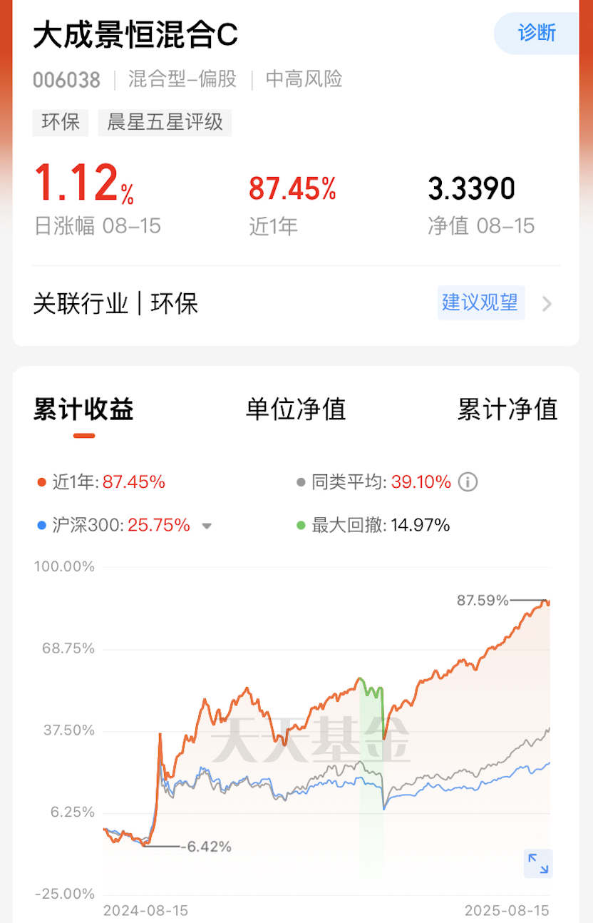 本人今日加仓此基1千元。近期政策大力支持科技创新,小盘股景气度高企,市场行情火热。大成景恒聚焦小盘量化策略,重仓医药、科技等高增长行业,盈利能力强劲。从成立以来年化收益约20%,且普比率2.77,性价比超98%同类。近一年收益显著优于同类,今年不断创新高,回调幅度小,趋势稳健。当前震荡市中,此基稳定性强,长短期都值得配置,因此趁着目前不限购,本人建仓(详情页提供大额卡券,记得领取)不做投资建议。