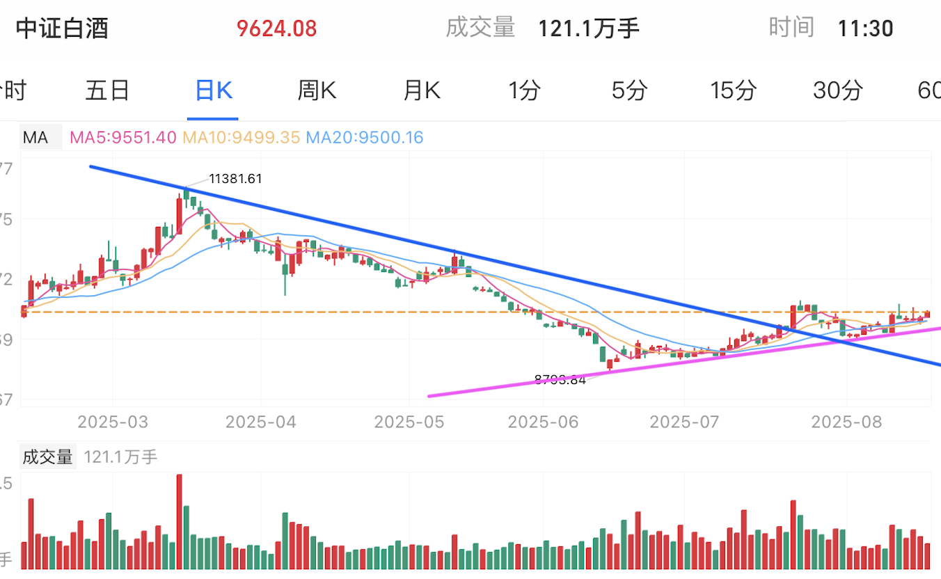 白酒近期较弱,此前止跌反弹,突破下跌趋势线,然而并没有开启行情,很快再次回落至支撑位。目前沿着支撑位窄幅震荡,暂时没有行情开启信号。