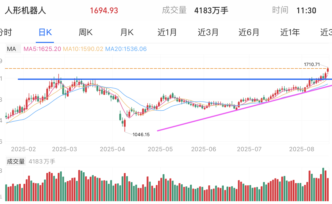人形机器人中长期较大行情,后力竭调整。在数月盘整后,最近终于突破最高点,目前打开上行通道,开启新行情。今日持仓股表现一般,最近也落后于其他科技,因此本人将一半仓位转至通信。从趋势看,它很可能继续上涨,大概率转错,不做投资建议。