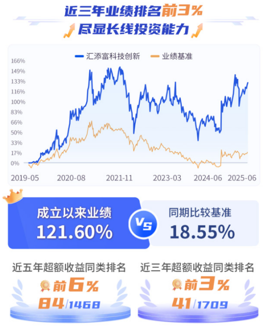 注:数据来源:汇添富科技创新灵活配置混合型证券投资基金2025年第2季度报告,截至2025/6/30,其中基金成立以来及各年度业绩、比较基准分别为:132.85%/18.55%(成立以来)、23.48%/9.00%(2019)、72.61%/37.75%(2020)、16.00%/2.14%(2021)、-24.80%/-20.19%(2022)、-6.51%/-16.42%(2023)、16.03%/10.23%(2024)、15.46%/5.13%(2025H1),数据来源于基金各年度报告及2025年二季报,基金历史业绩不代表未来预期,同类排名来自国泰海通基金超额收益排行榜,分类为灵活策略混合型,近三年排名为41/1709,区间为2022/7/1-2025/6/30,近五年排名为84/1468,区间为2020/7/1-2025/6/30。