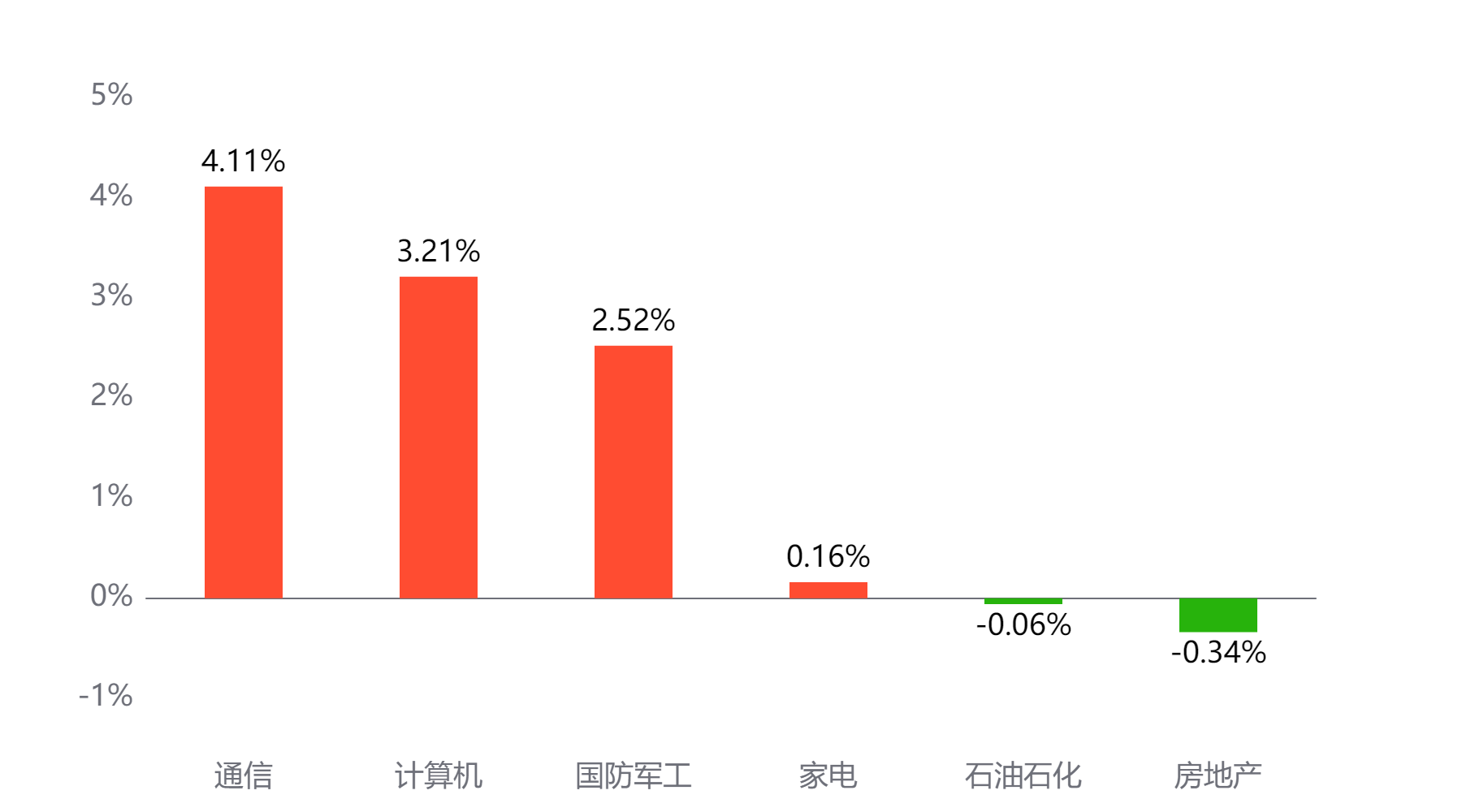 今天表现最好的行业板块依次为通信、计算机、国防军工,表现最差的依次为家电、石油石化、房地产。