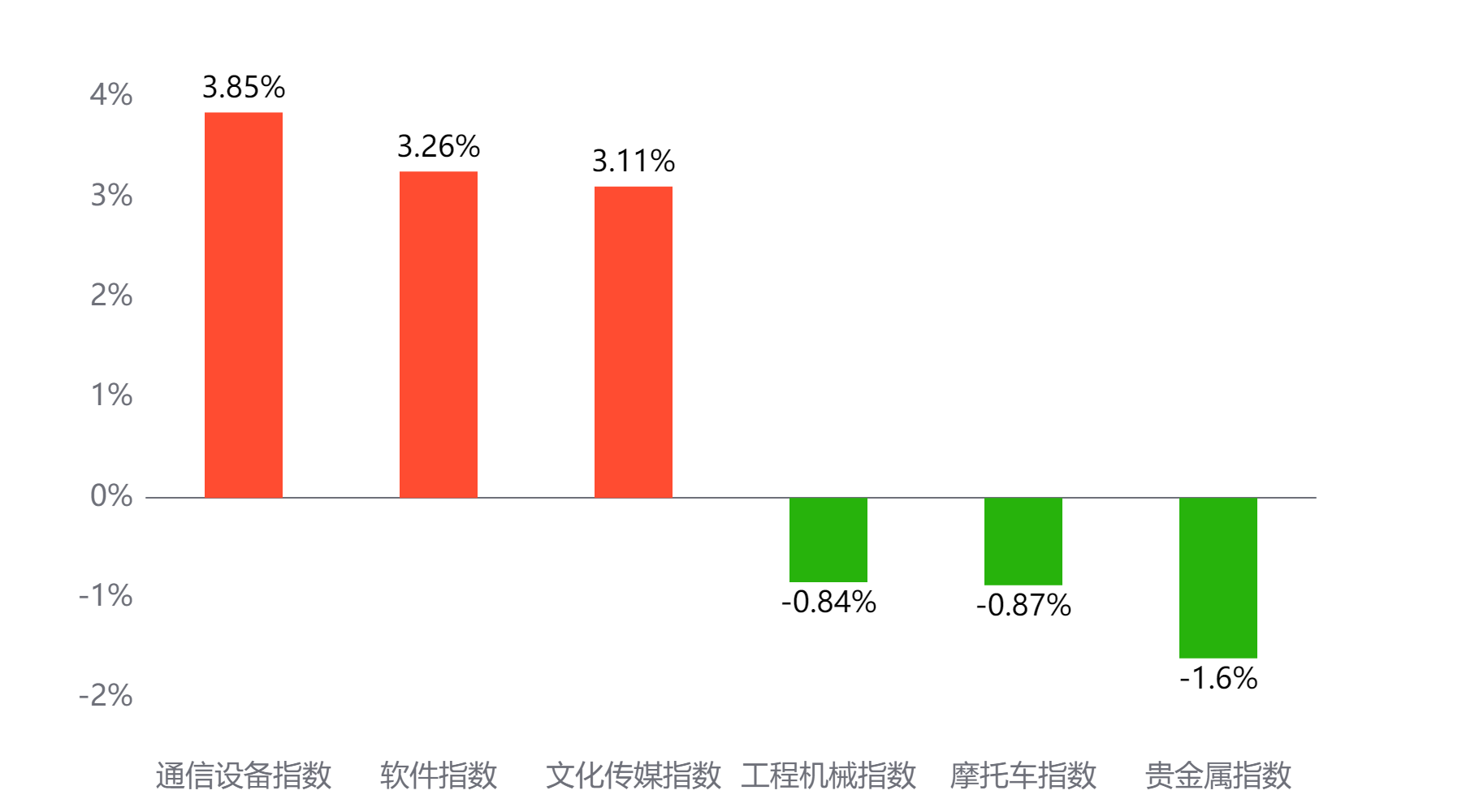 今天表现最好的主题概念依次为通信设备、软件、文化传媒,表现最差的依次为工程机械、摩托车、贵金属。