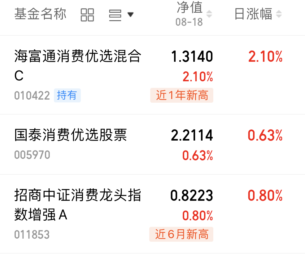 今日大盘延续涨势,消费板块表现亮眼,食品饮料、家电等细分领域集体上扬。在居民消费需求回暖与政策刺激下,消费股迎来上涨行情,下面来看最新净值情况: