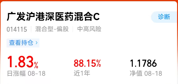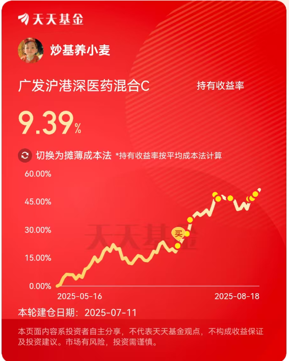 兄弟姐妹们,麦爸又来嘚瑟收益啦!$广发沪港深医药混合C(OTCFUND|014115)$今天再涨 1.83%,这波连加四天仓真是加对了,跟踩准了鼓点似的!#晒收益#
