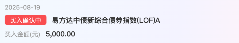 $易方达中债新综合债券指数(LOF)A$+5000,最近债市回调主要因为股市虹吸效应(沪指站上3745点创十年新高)及国债供给压力,这只基金作为一只中长债指数债权基金,107.9%仓位集中于国债+政策性金融债(如25附息国债06、24国开债),可以有效规避信用债违约冲击;尽管短期承压,该基金长期表现不错,近1年收益率2.65%,近3年收益率11.81%。当前债市调整反而创造入场机遇,央行二季度报告重申“落实落细适度宽松货币政策”,资金面宽松环境未变;股市情绪高涨后或面临分化,资金回流债市概率提升,利率债将率先受益,今天先补5k。