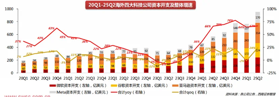 海内外云厂商资本开支再创新高,同比增速保持高位。据西南证券统计,25Q2海外四大云厂商(亚马逊、谷歌、Meta、微软)资本开支约950亿美元,同比增长64%,环比增长24%,投资规模均超出市场预期。从指引来看,本季度资本开支预估也大幅上调,四大云厂商2026年资本开支指引合计增加了约500-750亿美元。此外,尽管资本开支增加,大型科技股的整体利润率依旧非常强劲,按照GAAP每股收益修正值衡量达到4-10%,这也构成了市场认为资本开支增长是可持续的重要理由。国内方面,上周腾讯发布财报,当季资本开支191亿元,同比增幅达119%。(提及具体公司仅为说明行业观点,不构成投资建议,下同)