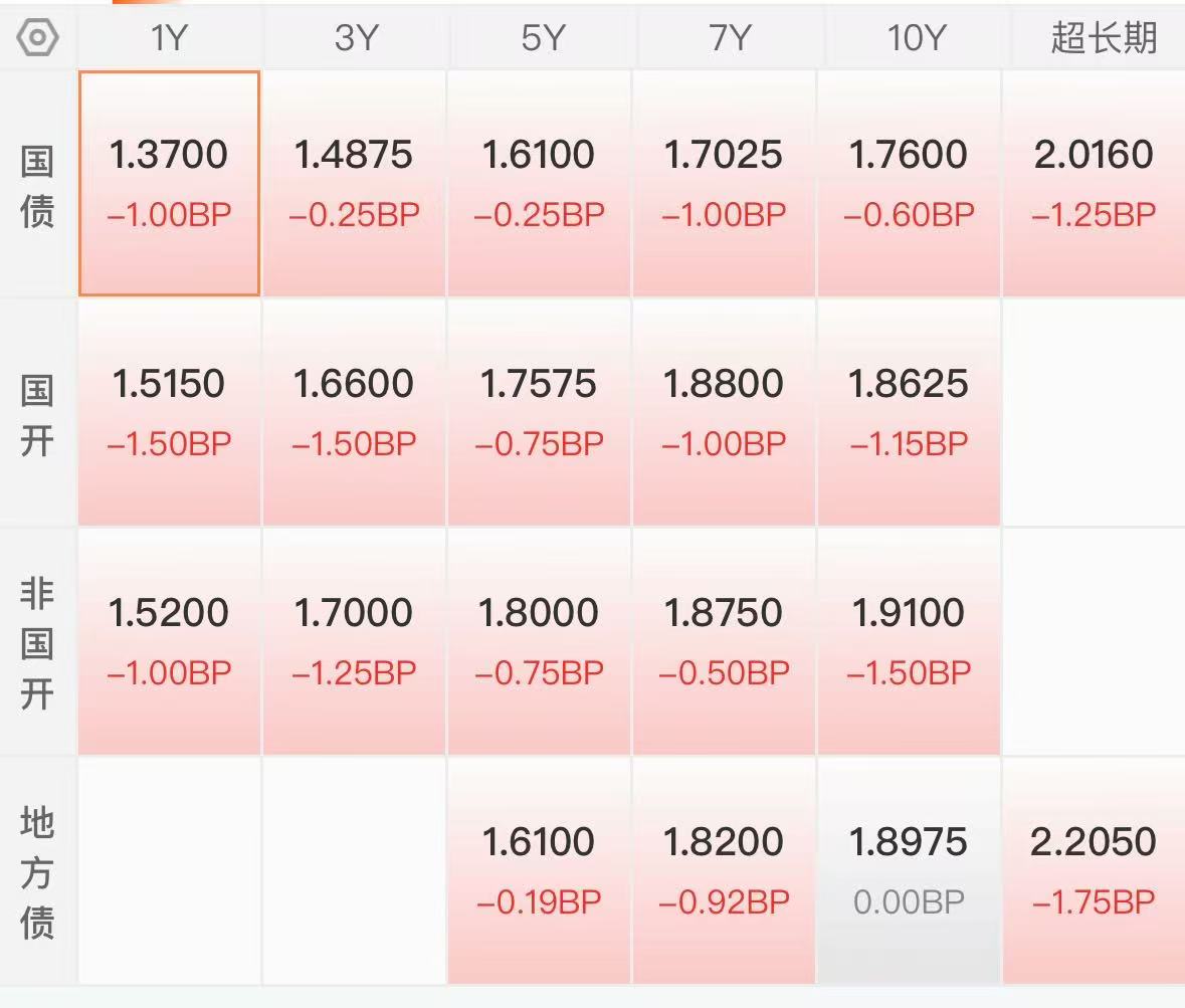 10年期国开活跃券债收益率:下行1.15p,报1.8625%;