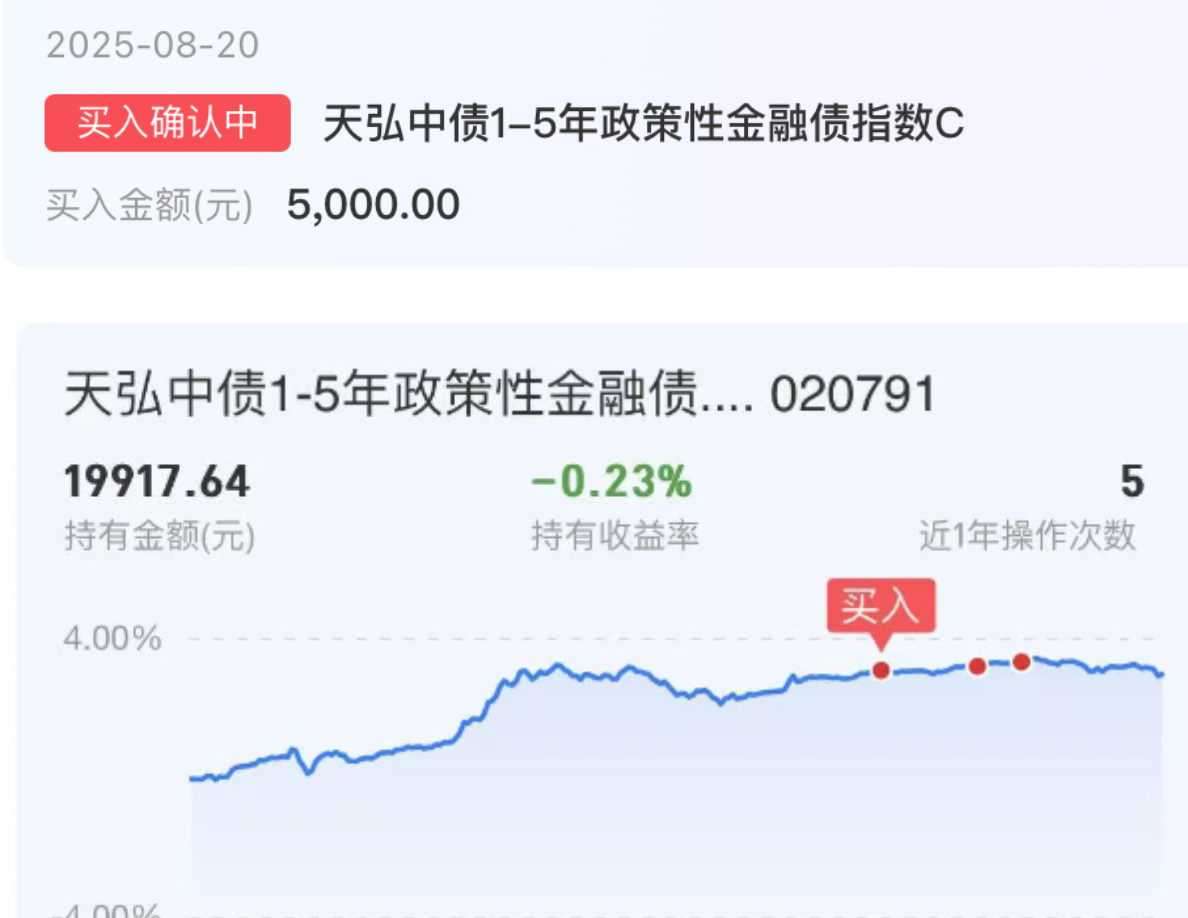 $天弘中债1-5年政策性金融债指数C$+5000,前段时间债市的调整,反而创造入场机遇,央行二季度报告重申“落实落细适度宽松货币政策”,资金面宽松环境未变;股市情绪高涨后今天震荡下行,资金重新回流债市,利率会先明显,今天加仓这支跟踪中债1-5年政金债指数基金,近一年收益率2.99%,还是比较稳健的,展现出在利率敏感期的防御特性。该基金采用指数化策略,精准聚焦国开行、农发行、进出口银行发行的1-5年期政策性金融债,格格今天再加仓一些。