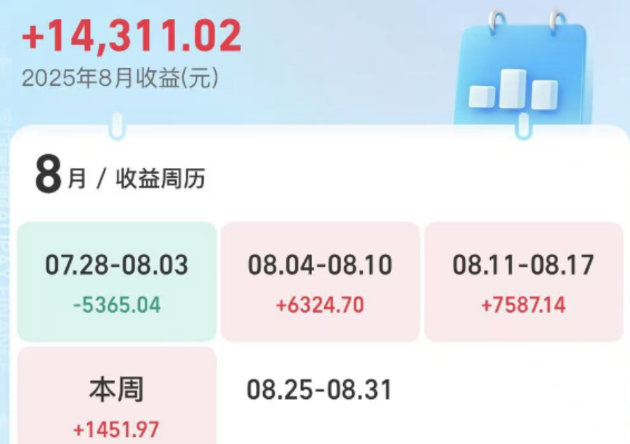 刚刚看了一下,今天竟然还是小赚几百块,因为今天白酒给力很给力,这个月稳稳收入14311.02元了,今天权益类震荡,因为我目前权益类基金大约30万左右,所以这波我打算继续持有,找机会继续加仓进去,今天继续布局一些。