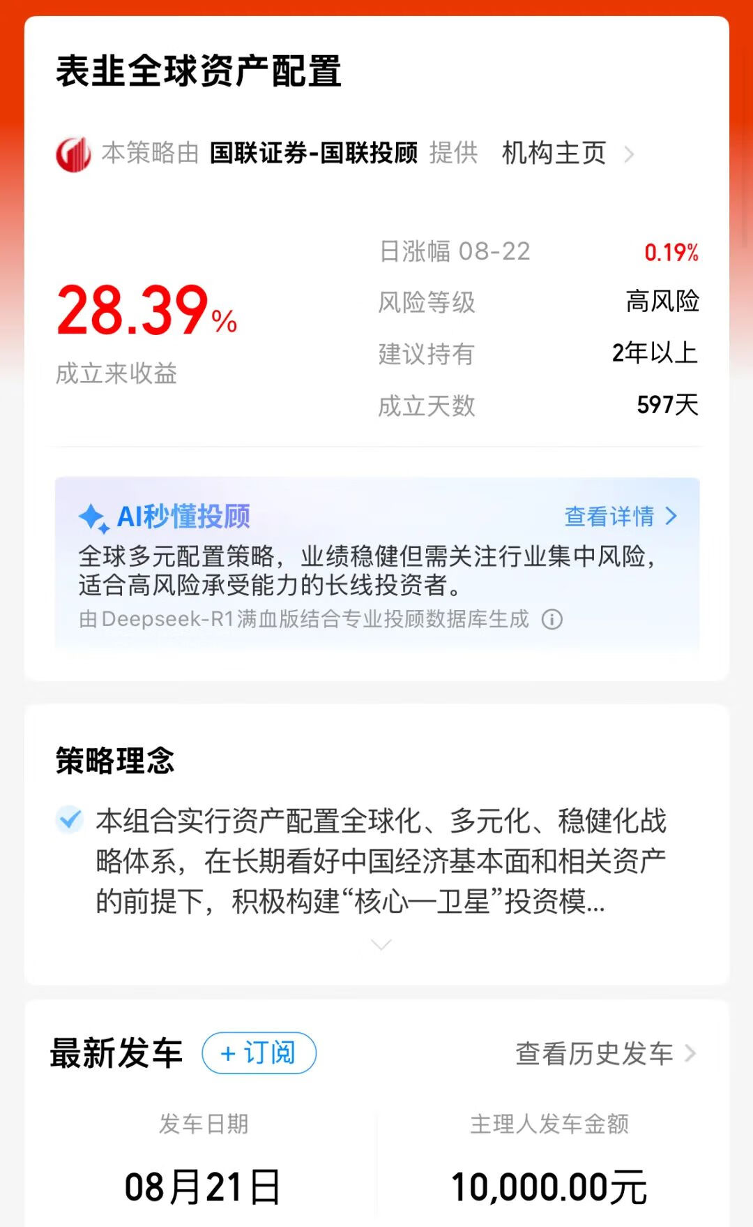 想一起跟「表韭全球资产配置」的小伙伴,平台包括天天基金,在平台搜索,「表韭」,就能看到结果了,具体请见,《必看,基金投顾的十问十答》。
