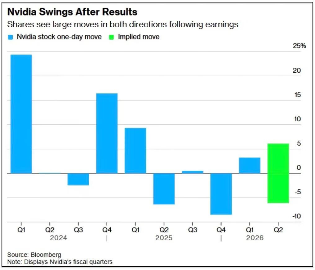 下图,可以看到,英伟达在每次披露业绩后的一个交易日,变动都不小,本次财报看点除了AI需求带动的增长外,还要看看H20芯片发货中国的情况。