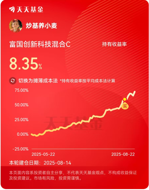家人们今天A股给科技股开狂欢派对啦!创业板指飙2.22%,半日成交砸出2万亿,CPO和AI芯片板块直接嗨到飞起。咱麦爸8月14日上车的$富国创新科技混合C(OTCFUND|011120)$太会了,上周五大涨4.04%,近一月大涨32.9%,牛!看持仓像装了导航——重仓的新易盛、寒武纪这些CPO和AI芯片龙头,全是今天领涨的显眼包。科技指数从建仓时1533点冲到1694点,这卡点精准得像外卖准时送达。基金经理这波操作比奶茶第二杯半价还香,继续坐等收益曲线往上蹦~