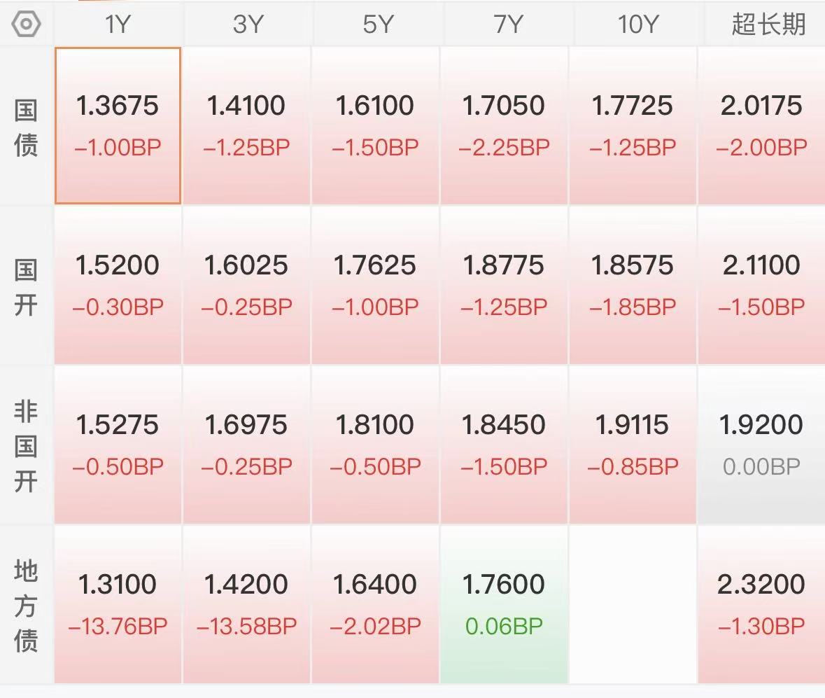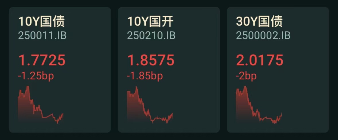 10年期国债活跃券收益率:下行1.25bp,报1.7725%;