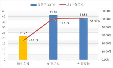 当前恒生科技指数的市盈率仅约21.77倍(PE-TTM),处于历史较低水平。这一估值不仅低于近五年中位数33.04,近五年历史百分位仅23.46%,更是显著低于纳斯达克41.18倍和创业板指38.86倍的市盈率,估值具有一定优势。