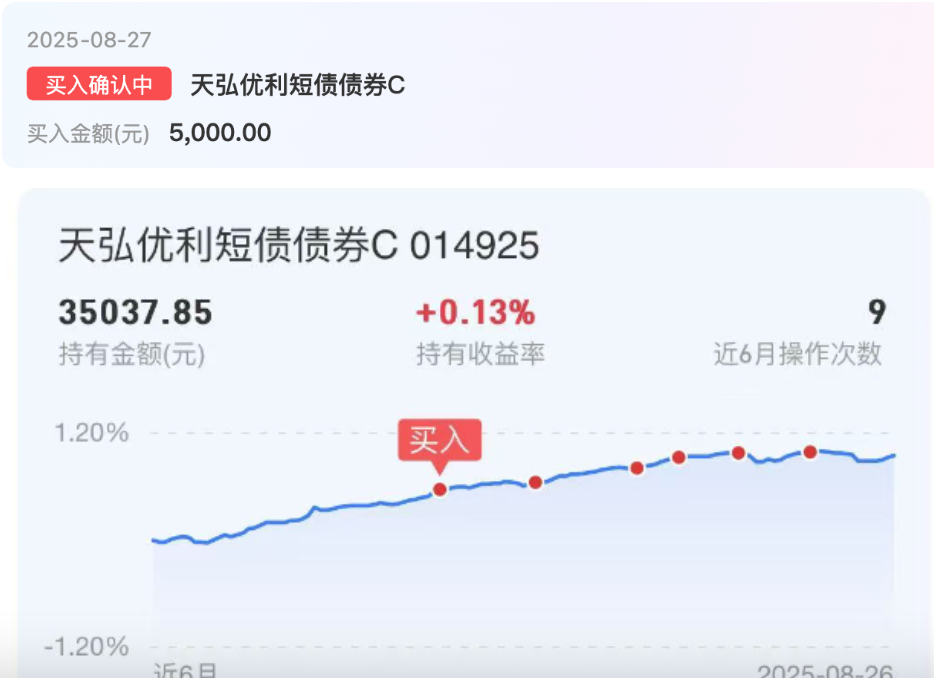 $天弘优利短债债券C$+5000,最近YM降准释放长期资金,叠加存款利率三连降,市场资金面松得像开了闸,利好中短债基!优利作为短债基,近3年涨幅7.75%,仓位主要配置AAA国企债+政策性金融债,这种高评级短久期组合既吃着票息,又能快速变现扛波动。还有就是满7天就免赎回费,格格继续加一些作为底仓配置上。
