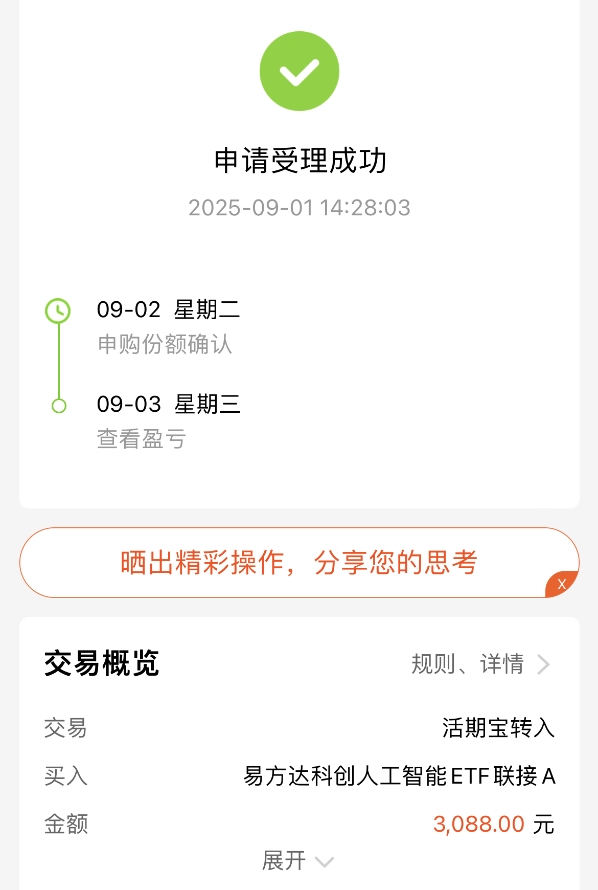 今天大盘整体还行,上午科技板块出现回调,下午拉升不少,我觉得这是个不错的加仓机会,今天加了点$易方达科创人工智能ETF联接A(OTCFUND|023564)$。科创人工智能领域是当下的主线方向,发展潜力大,而且这只基金业绩弹性比中证人工智能指数更强,更能精准捕捉AI行情,现在逢低买入,希望能跟上后续的上涨趋势。