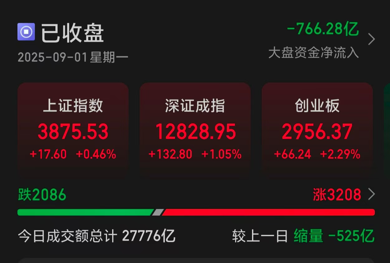 指数表现,沪指涨0.46%,深成指涨1.05%,创业板指涨2.29%。个股涨多跌少,全市场超3200只个股上涨。市场全天成交额2.77万亿,较上个交易日缩量525亿。