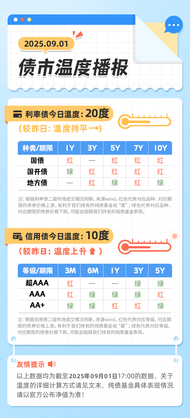 温度设定从0度开始,1个红色格子=温度提升2度。假设当天信用债市场的15格子中,有5个格子是红色,10个格子是绿色,那么当天信用债市场的温度为10度,利率债温度计算同理。