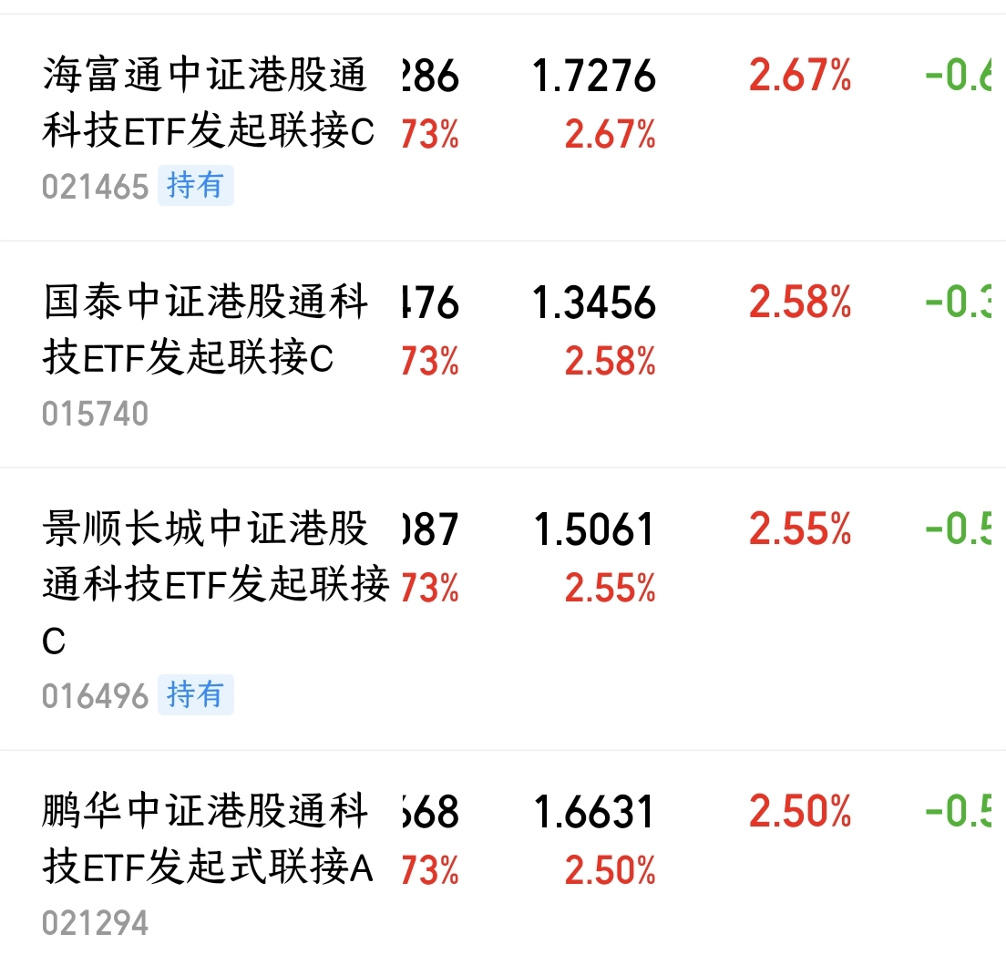 $国泰中证港股通科技ETF发起联接C(OTCFUND|015740)$今日上涨了2.58%