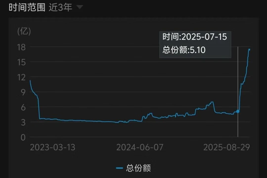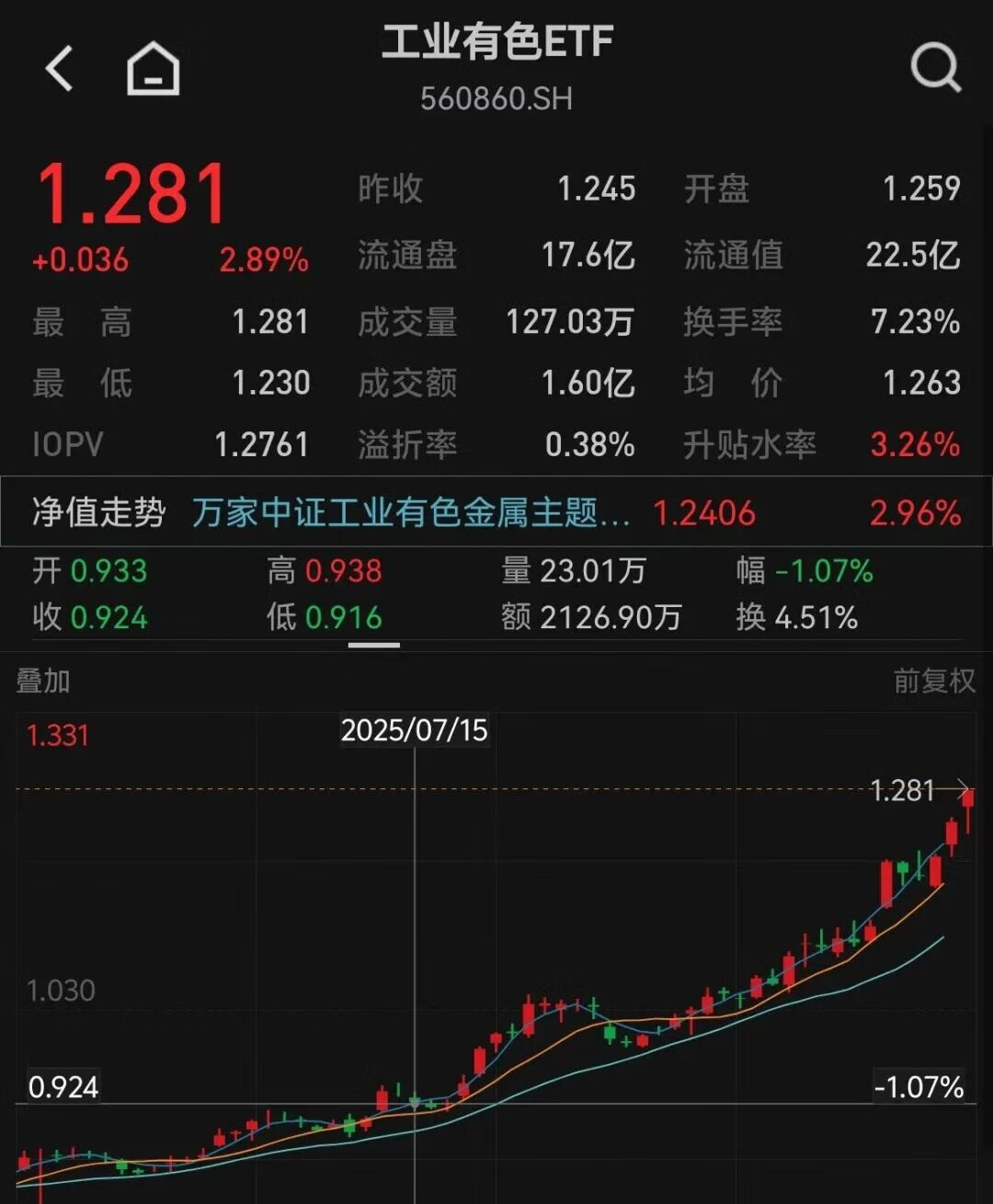 因此,看表韭量化的持仓,就能看到,组合一直拿着黄金股、有色相关的指数基金,其中,7月中旬的调仓中,观察到,加了工业有色ETF560860,当时表韭量化调入的时候,产品规模才5亿份,现在已经接近20亿份了。