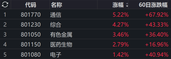 按照申万一级,昨天涨幅前五分别是通信、综合、有色、医药,以及电子,下图,除了医药以外,其他四个行业,按照近60日来看,也正好是涨幅前四的行业。