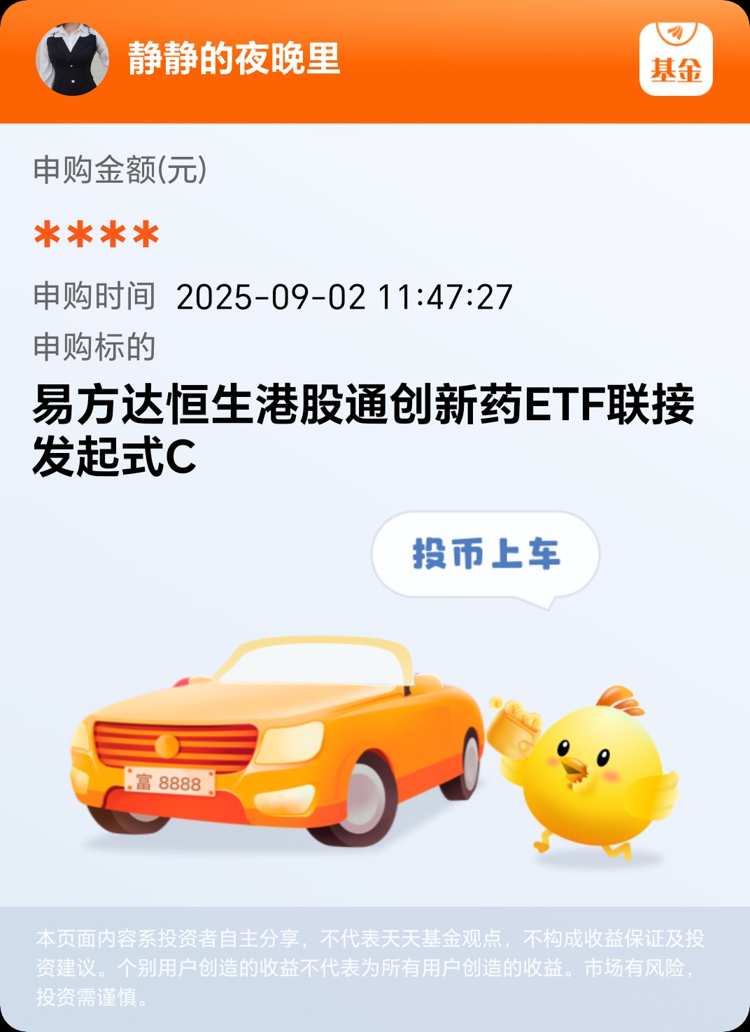 今日大盘出现下跌行情,其中三大指数集体下跌,大科技更是迎来深度回调,但我发现近期创新药赛道却能持续火热不断,连续多日带来领涨性行情,我也准备加仓一波$易方达恒生港股通创新药ETF联接发起式C(OTCFUND|024329)$聚焦纯正的创新药,昨日大涨4.48%,远超同类基金涨幅,业绩表现优秀亮眼,而当下海外市场即将迎来新一轮降息周期,创新药产业有望迎来一轮景气共振,所以我也将长期看好这一赛道,后续慢慢定投买入起来!
