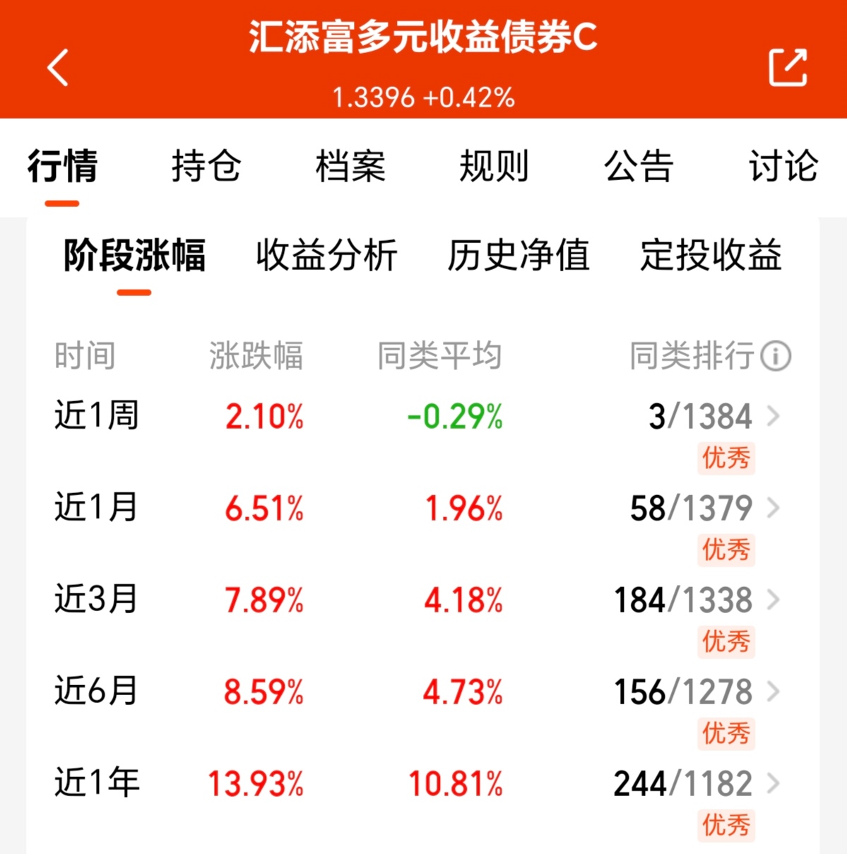今日权益市场行情出现波动加剧,债市行情小幅上涨,而当下行情中,如果持仓的品种比较单一,那么不但会面临风险和波动,同时还有可能让收益越发缩水,反观固收+产品,自今年以来一直稳定上涨,取得了非常优秀的成绩,就以我看好的$汇添富多元收益债券C(OTCFUND|470011)$来说,作为固收+中的科技特种兵,投资策略以稳定的信用债为主,同时运用科技增强收益,这样的持仓配置,既具备了债券的稳定属性,还同时又能紧跟股市上涨潜力 !