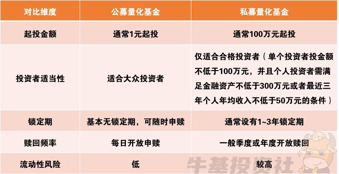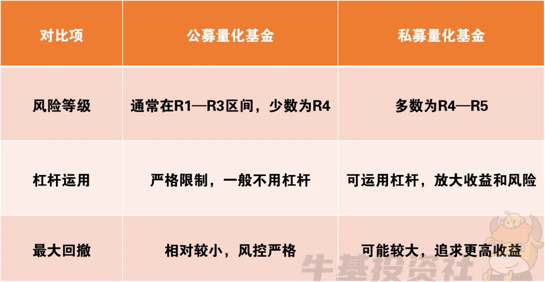 公募量化基金风险等级多为R3,一般不用杠杆;私募基金风险等级多为R4—R5,可能运用杠杆,波动较大。
