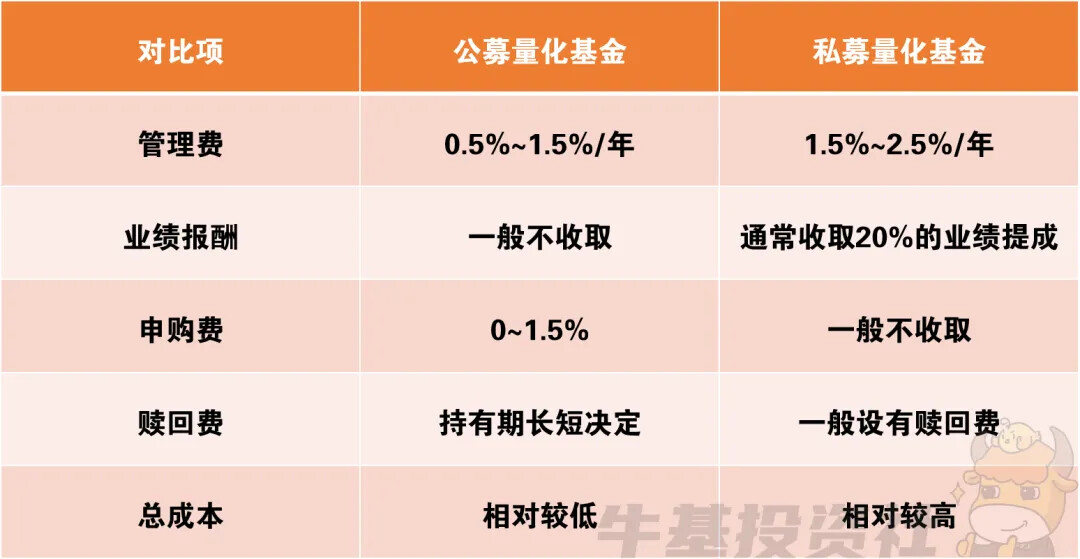 公募量化基金主要以管理费为主,一般不收业绩报酬;私募基金一般是2%管理费+20%业绩报酬。