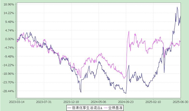 信澳优享生活混合A(017977)成立于2023年3月14日,截至2025年6月30日,信澳优享生活混合A过去1年净值增长率为45.14%,同期业绩比较基准为15.39%,成立以来累计净值增长率为12.96%,同期业绩比较基准-1.09%。