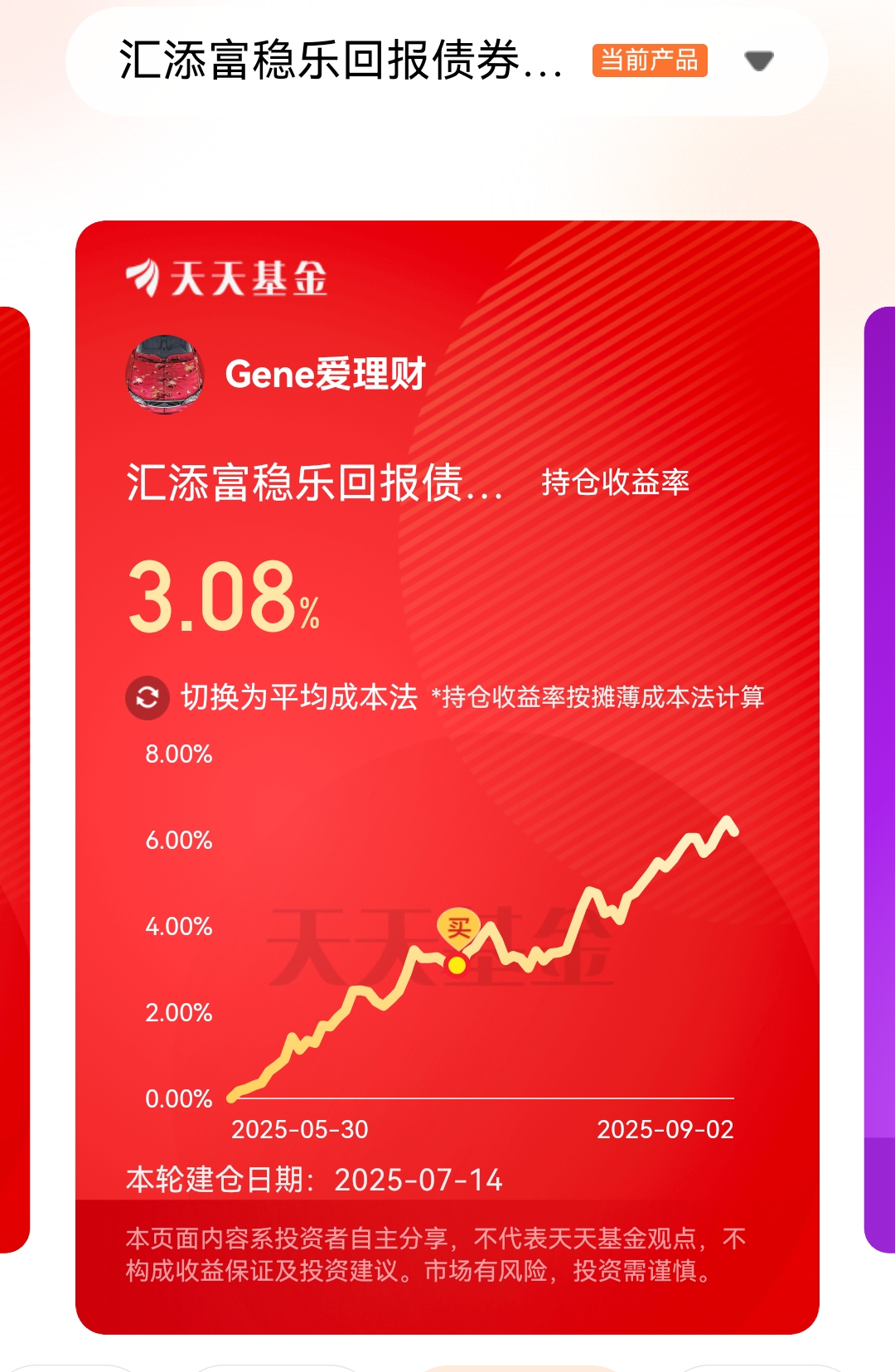 今年多亏了配置不少固收+,坐收牛市成果。持仓中的$汇添富稳乐回报债券发起式C(OTCFUND|018768)$就是这么一只混合二级债,这只基金以利率债打底(占比81.11%),叠加港股生物医药等成长板块和银行、公用事业等防御板块,可谓攻守兼备,周周正收益,近1周领跑热门固收。我持有一个多月,收益率就高达3.08%,体验感相当不错,既把握权益资产上涨带来的收益,又注重风险分散,不愧是我的压舱石。