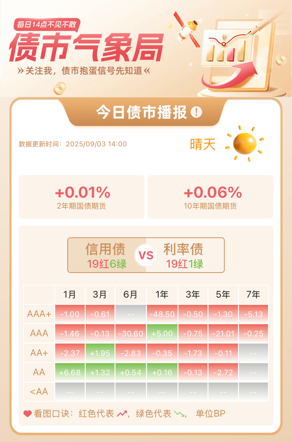 债市目前总体“晴天”,2年期、10年期国债上涨,信用债、利率债均涨多跌少。