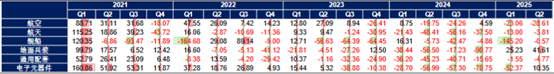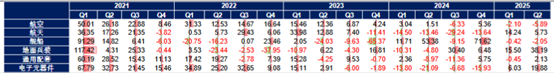 从细分下游看,收入端25Q2通用配套同比增速转正,电子元器件、地面兵装同比增速大幅提高,航天同比增速回落,航空、舰船同比仍然下跌。
