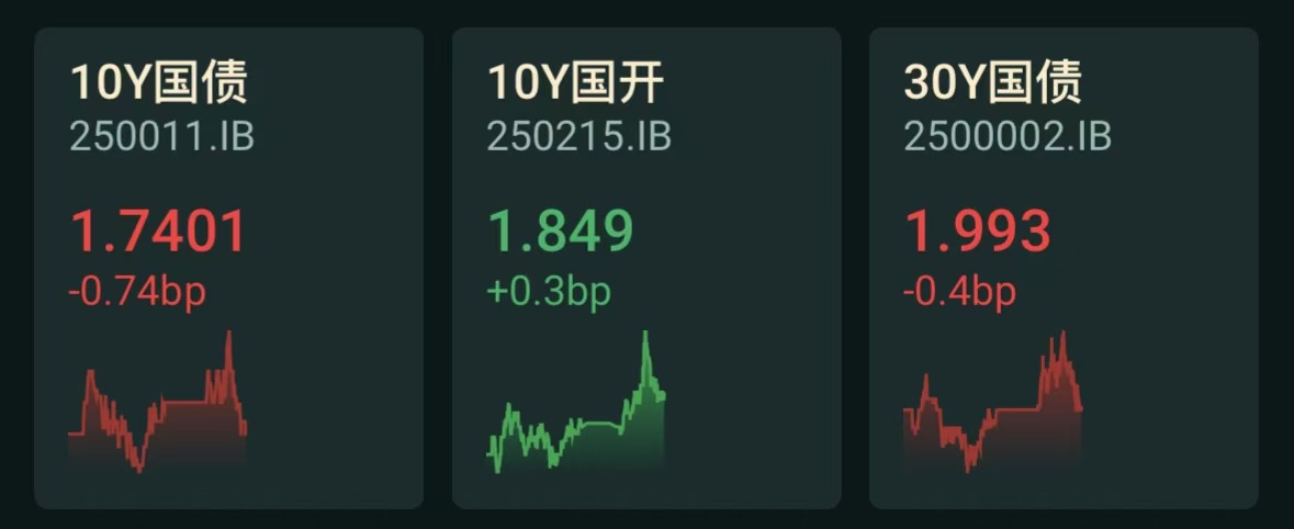 10年期国债活跃券收益率:下行0.74bp,报1.7401%;