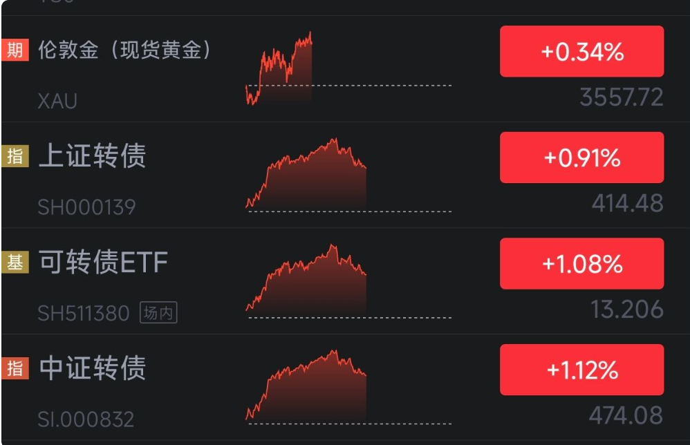 可转债及黄金 :黄金涨幅0.34%,昨天回落也是个不错介入机会,可转债连跌几天,今天大晴,固收+回血行情,持仓标的中可转债占比高的整体受益。