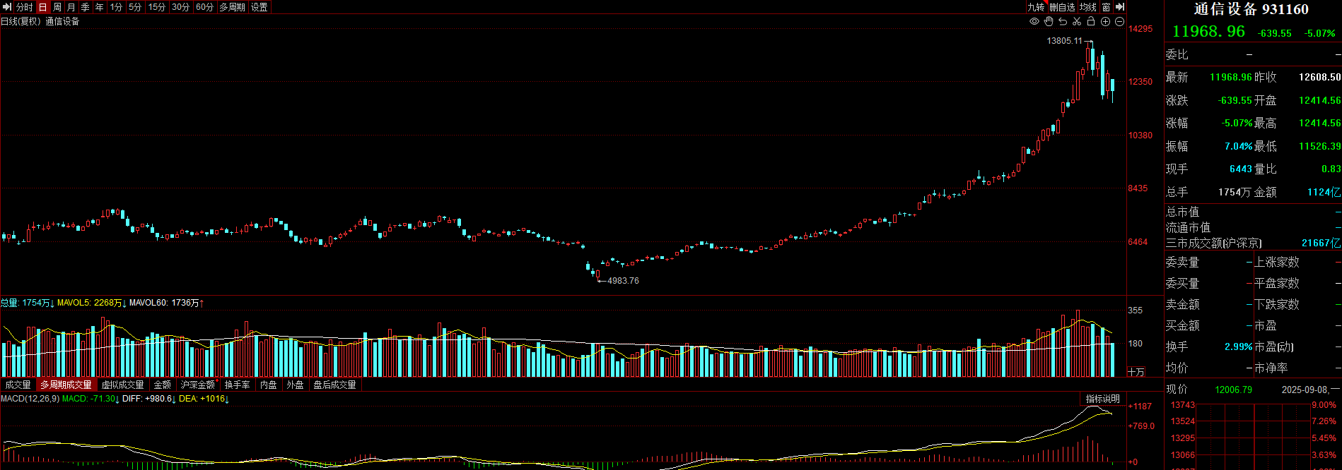 通信设备超跌6%,前期涨幅多疯狂,现在跌得多狼狈,但好在20日均线的支撑还在,所以我今天不杀跌,就算要走的话,也要等近期的反弹,目前先观察一下。