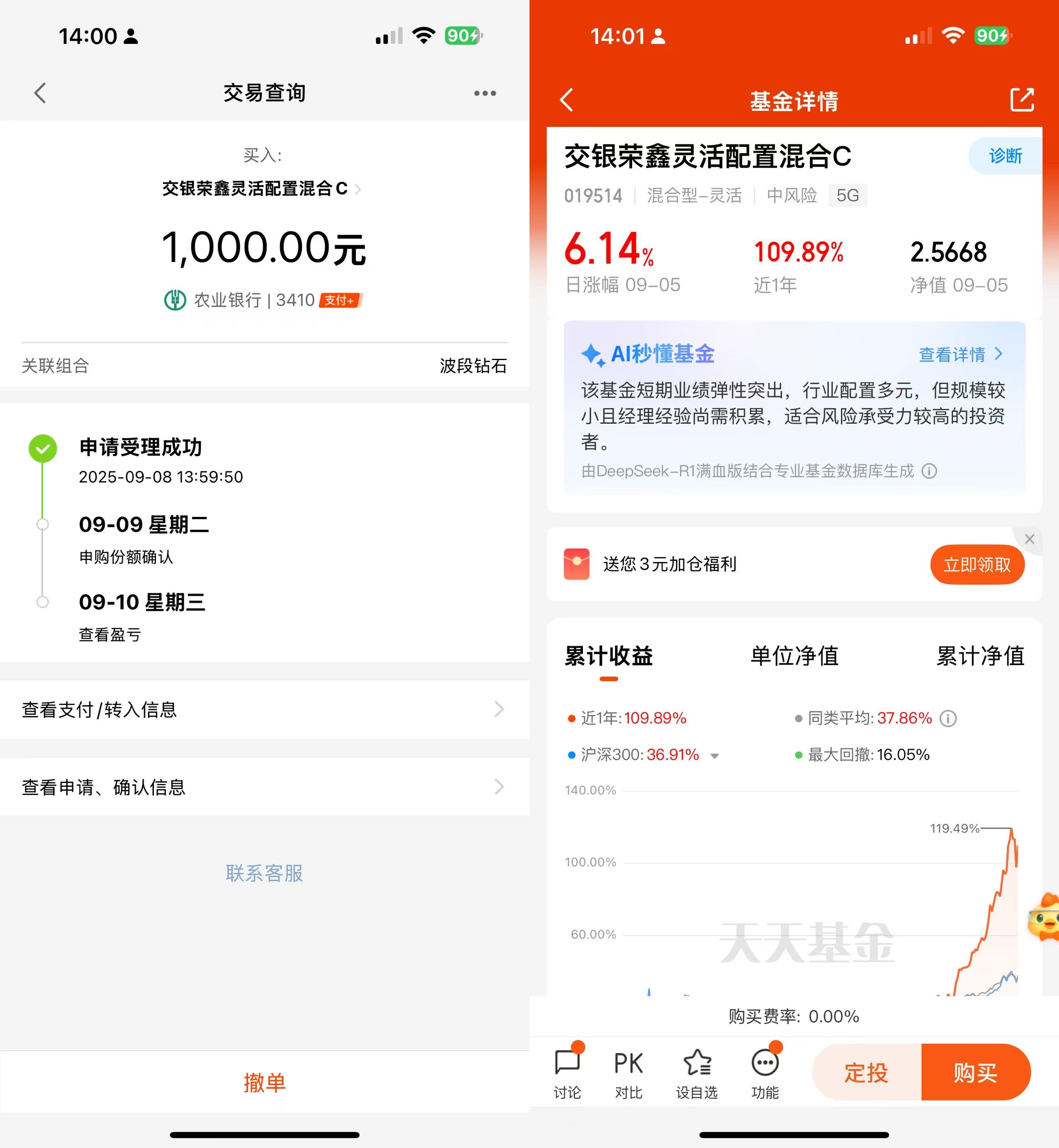 操作:低吸上车1000元$交银荣鑫灵活配置混合C(OTCFUND|019514)$基金,这是一只聚焦科技成长板块,特别是在AI人工智能和算力领域进行重点布局,其核心投资逻辑是把握中国经济转型和产业升级过程中,AI技术革新带来的投资机遇,该基金前两大重仓股中际旭创和新易盛均是全球光模块领域的领军企业,光模块是数据中心内部和设备间数据传输的关键部件,其速率和性能直接决定算力集群的效能,该基金最近6个月涨幅高达78.58%,最近1年涨幅高达109.89%,表现非常优秀。