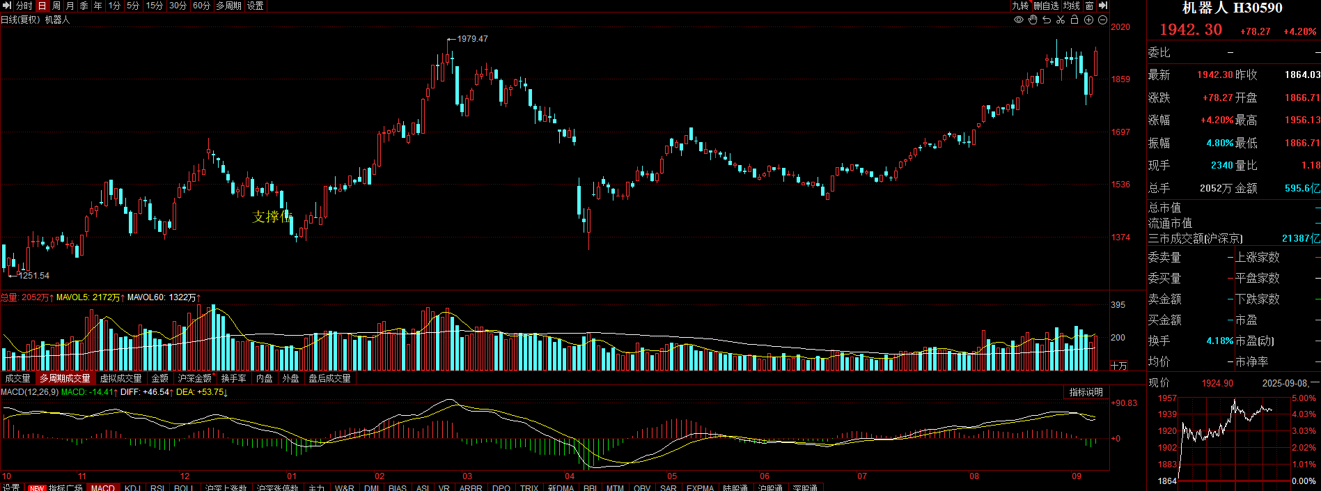 今日机器人指数高开高走,盘中涨超3%,技术面上已经成功的上穿5日、10日、20日均线的支撑,多头趋势已经王者归来,相比很多科技行业,机器人的走势更强。9月初市场有些震荡,有可能凝聚新的主线,机器人前期涨幅较少,加上今日反弹加速度,非常有可能成为新的主线行情。市场最新消息,人形机器人再现亿元级订单!优必选签下全球人形机器人最大合同2.5万亿元,这是继7月斩获近亿元的全球人形机器人企业最大单笔订单后,优必选再次刷新纪录,这场由大订单驱动的商业加速度短期内能提振市场信心,摩根士丹利预计,到2028年,中国机器人市场规模将以年均23%的速度增长,达到1080亿美元。市场源源不断的利好,这是支撑机器人长线发展的重要支撑,当下机器人的趋势还在,我要继续乘风破浪,做大做强发车啦!