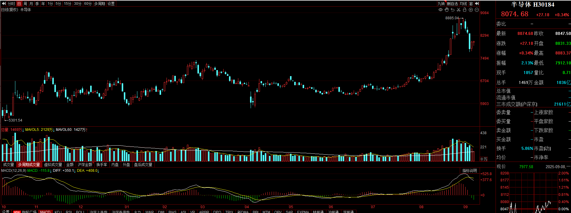 消息面上,2025年5月美国商务部更新公告,要求全球所有使用美国技术的芯片厂商停止向中国出口AI芯片,外部压力进一步强化了国内实现半导体产业链自主可控的决心和紧迫感,为整个半导体产业链的发展提供了长期良好的政策环境,这是半导体发展的主要支撑。9月初以来,半导体产业出现了调整,但上周五行情已经止跌反弹,日K线已经成功的站上20日均线的支撑,虽然今日还是窄幅调整,但趋势是稳住了,所以我要趁着今日的回调,继续低吸上车,不管是博弈近期的短线也好,还在中长线的投资也罢,今日都是一个很好的低吸机会。