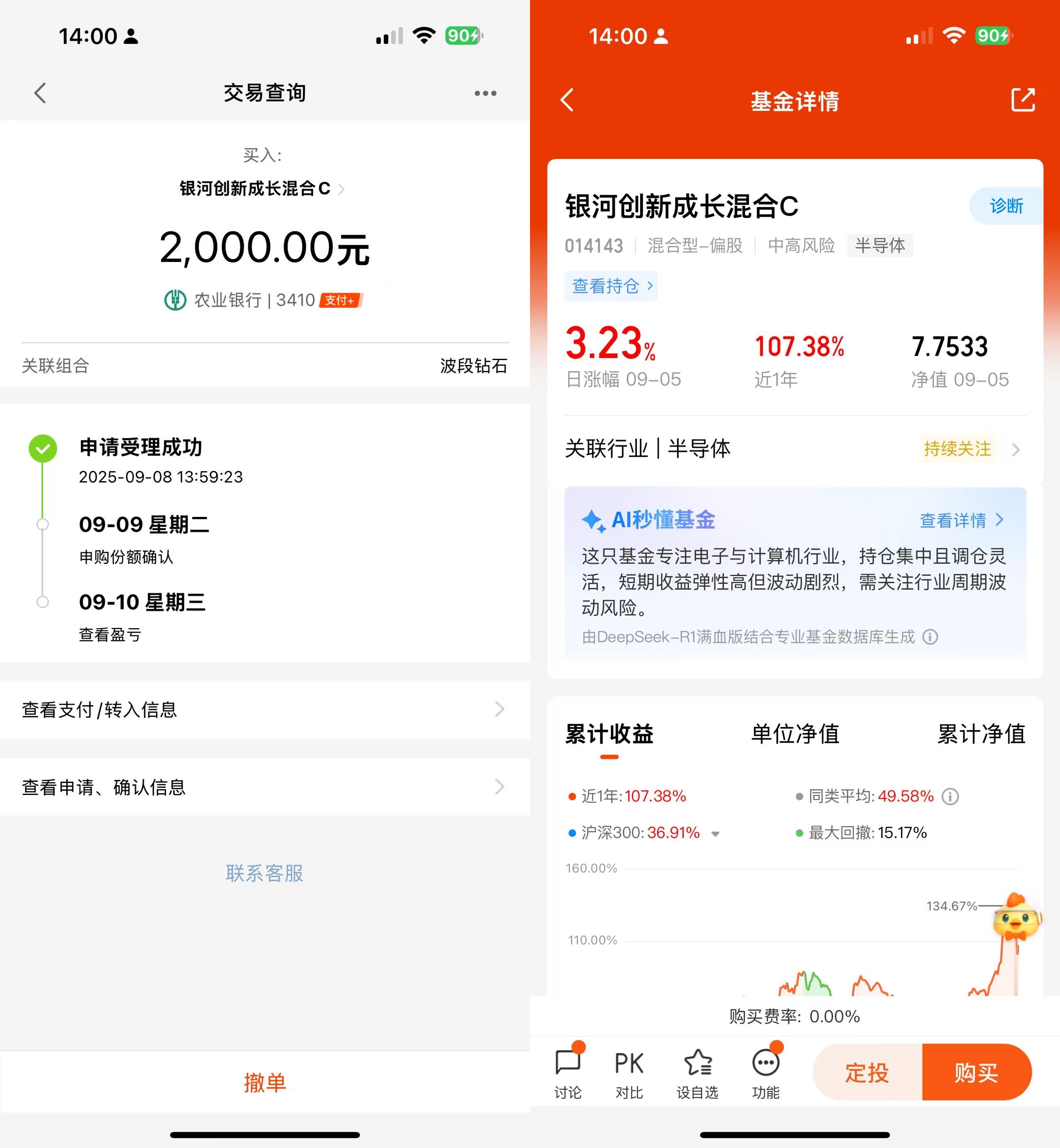 操作:低吸上车2000元$银河创新成长混合C(OTCFUND|014143)$基金,这是一只风格极致、进攻性突出的半导体基金,紧密围绕半导体产业链进行深度布局,其重仓股北方华创是半导体设备龙头,中芯国际是国内领先的晶圆代工厂,这些都有望受益于AI驱动下的资本开支增长和半导体行业周期复苏。该基金最近1年涨幅高达107.38%,远远超过了同类平均49.58%,在同行业中表现更加优秀。