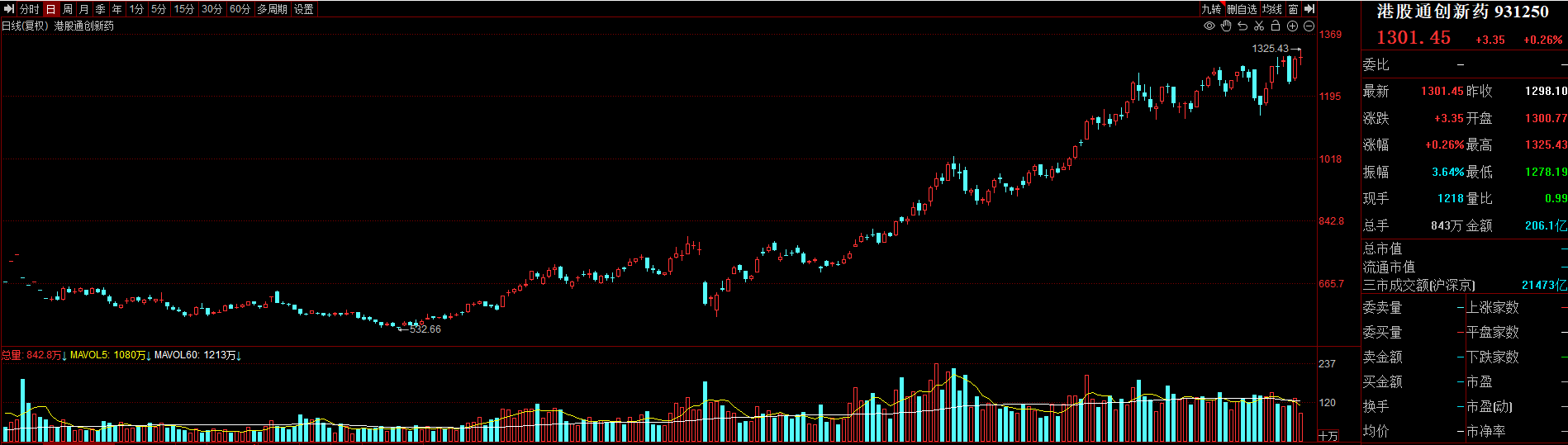 港股通创新药高位震荡,目前指数微微翻绿,但盘中已经创出了新高,短期5日均线的支撑也还在,所以创新药的趋势不变,当下我会继续格局。