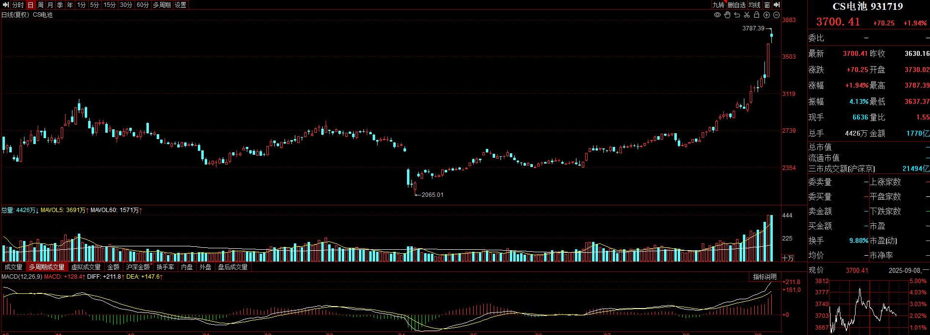 CS电池高位震荡,目前指数继续翻红,指数涨幅近2%,今日高位震荡到底是中继看涨信号,还是见顶信号呢?我个人更看好前者,因为目前电池的涨幅其实并不大,如果短期回踩5日均线,那或将是做加法的机会,当下我会继续格局,等待更加合适的加法机会。