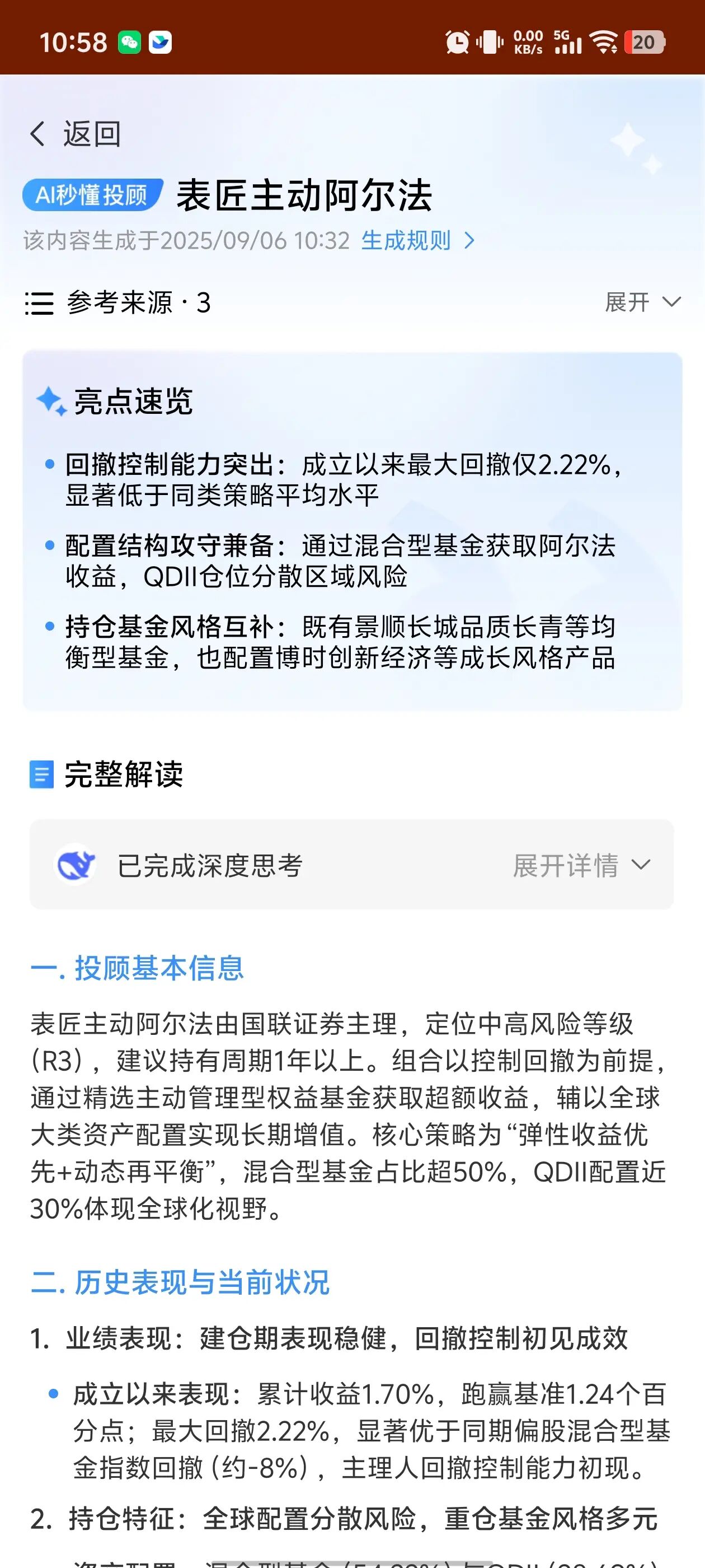 首先,在最外面的AI秒懂投顾,就有一句话总结:“通过主动选基与全球配置平衡收益与回撤,适合中高风险偏好且持有一年以上的配置型投资者”。