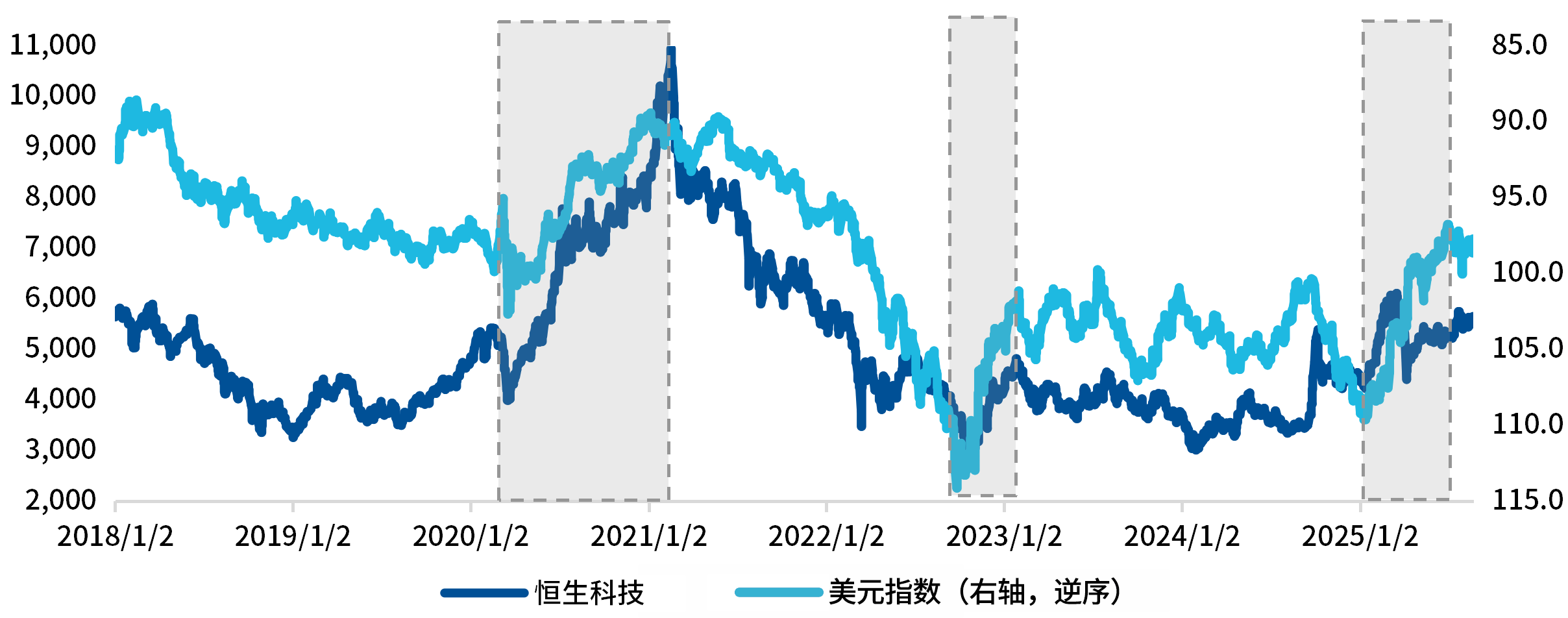 如图3所示,当美元指数处于下行通道时(美元持续贬值),美元资产的投资回报相对降低、吸引力减弱,这会促使国际投资者重新评估各市场的投资价值。如果部分资金流入港股市场,通常会为恒生科技指数提供重要支撑;反之,若美元指数走强,资金则更倾向回流美元资产。