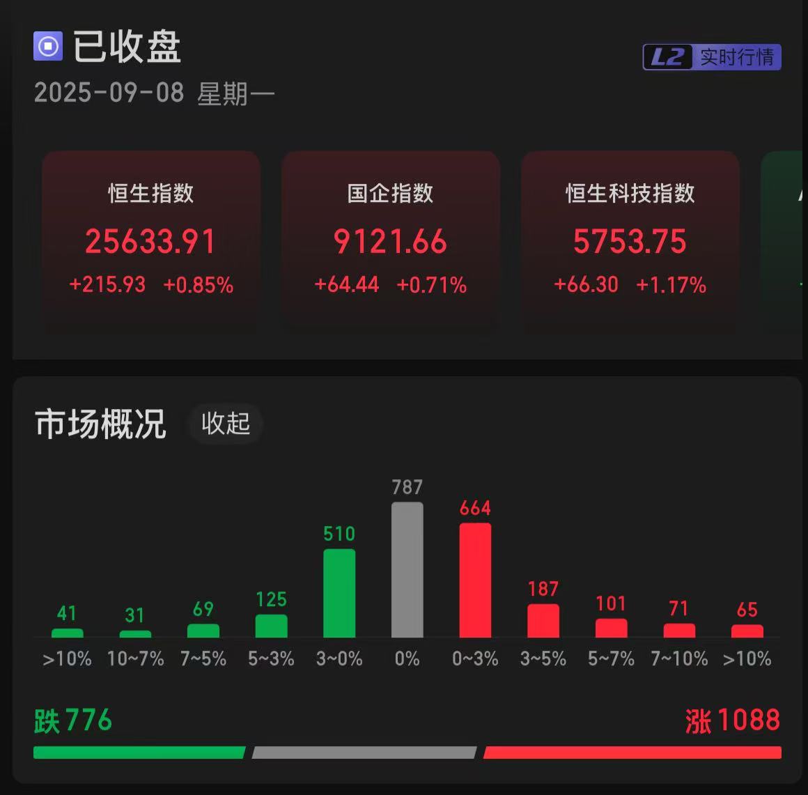 恒生指数上涨0.85%,国企指数上涨0.71%,恒生科技指数上涨1.17%。1088只个股上涨,776只个股下跌。南向资金,净买入167.05亿港元。