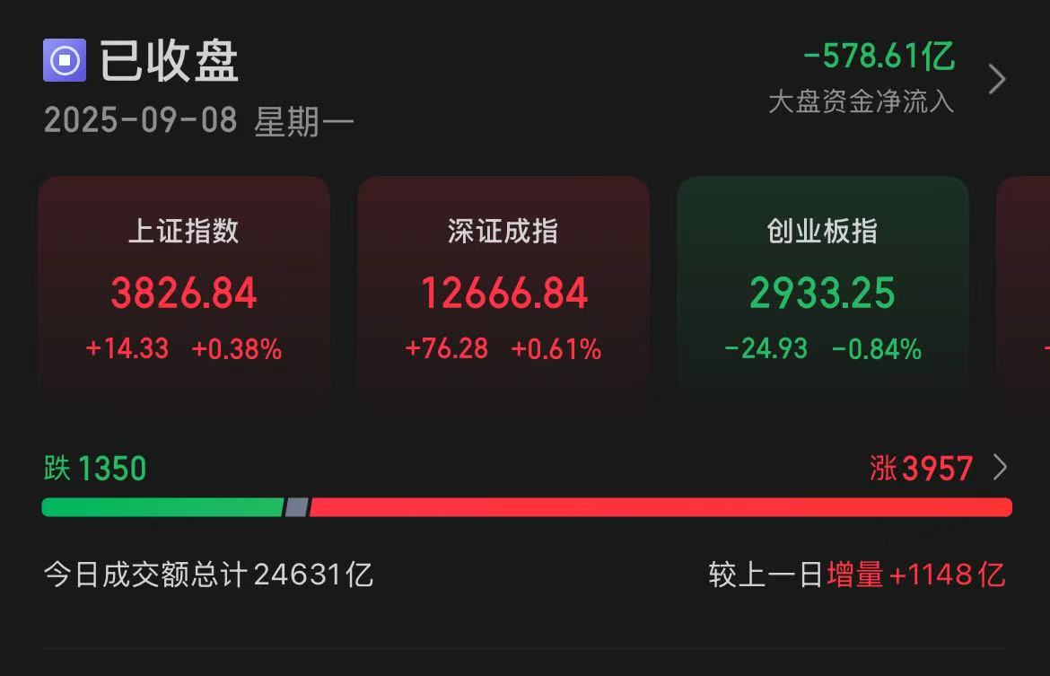 指数表现,沪指上涨0.38%,深成指上涨0.61%,创业板指下跌0.84%。个股涨多跌少,全市场3957只个股上涨,下跌个股1350只。市场全天成交额2.46万亿,较上个交易日增量1148亿。
