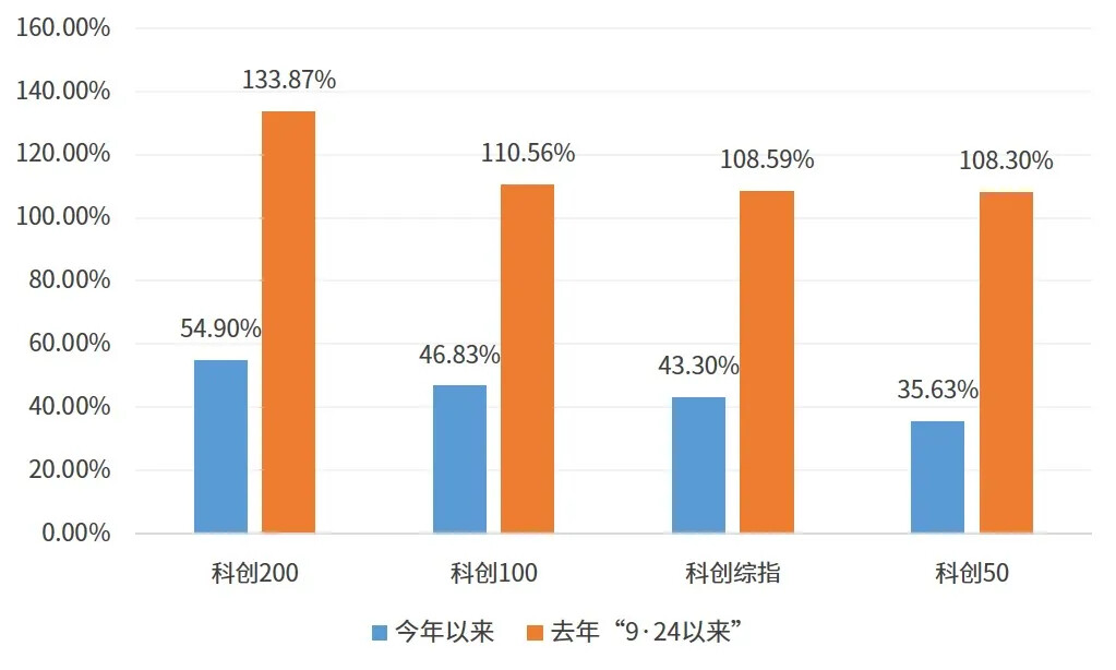 截至目前,科创板主要的宽基指数有科创50、科创100、科创200和科创综指等等。从下图来看,今年以来,以及去年“924行情”以来,这几个指数的收益率由高到低排列为:科创200>科创100>科创综指>科创50,其中科创200在两段区间内均跑赢了另外3只指数。